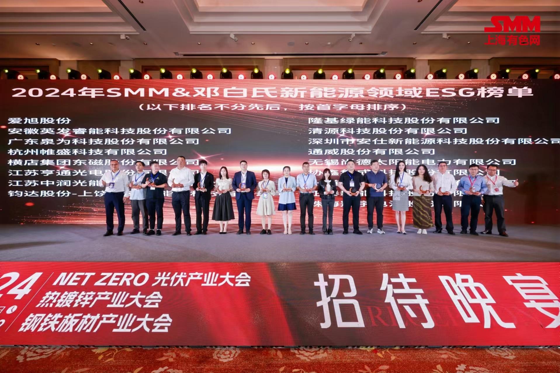 由SMM上海有色网举办的“2024 Net Zero光伏产业大会”在安徽合肥召开。清源科技受邀参与本次大会,并荣获2024年SMM&邓白氏新能源领域ESG榜单“ESG卓越企业奖”。